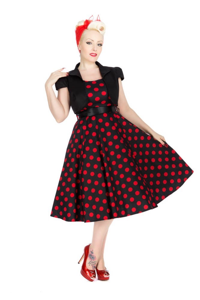 Embrace playful vintage vibes with the Orchid Bloom Black & Red Polka Dot Swing Dress. This delightful design pairs classic red polka dots against a deep black backdrop, finished with a sleek black waistband that cinches the waist for a flattering fit. The matching bolero jacket adds a chic layer, perfect for cooler evenings or to elevate your retro style. Crafted from a cotton-spandex blend with a hint of stretch and finished with a side zipper for ease of dressing, this dress is a versatile must-have.